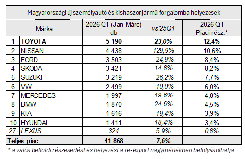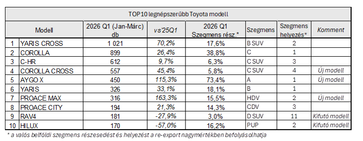 Minden korábbi rekordját megdöntve, a piaci bővülés több mint háromszorosát produkálva, 23%-kal növelte forgalomba helyezéseit a Toyota, így továbbra is toronymagasan Magyarország legkelendőbb autómárkája. A márka 2026 első negyedévét 5.190 darabos eredménnyel zárta, piaci részesedése pedig 12,4%-ra emelkedett.